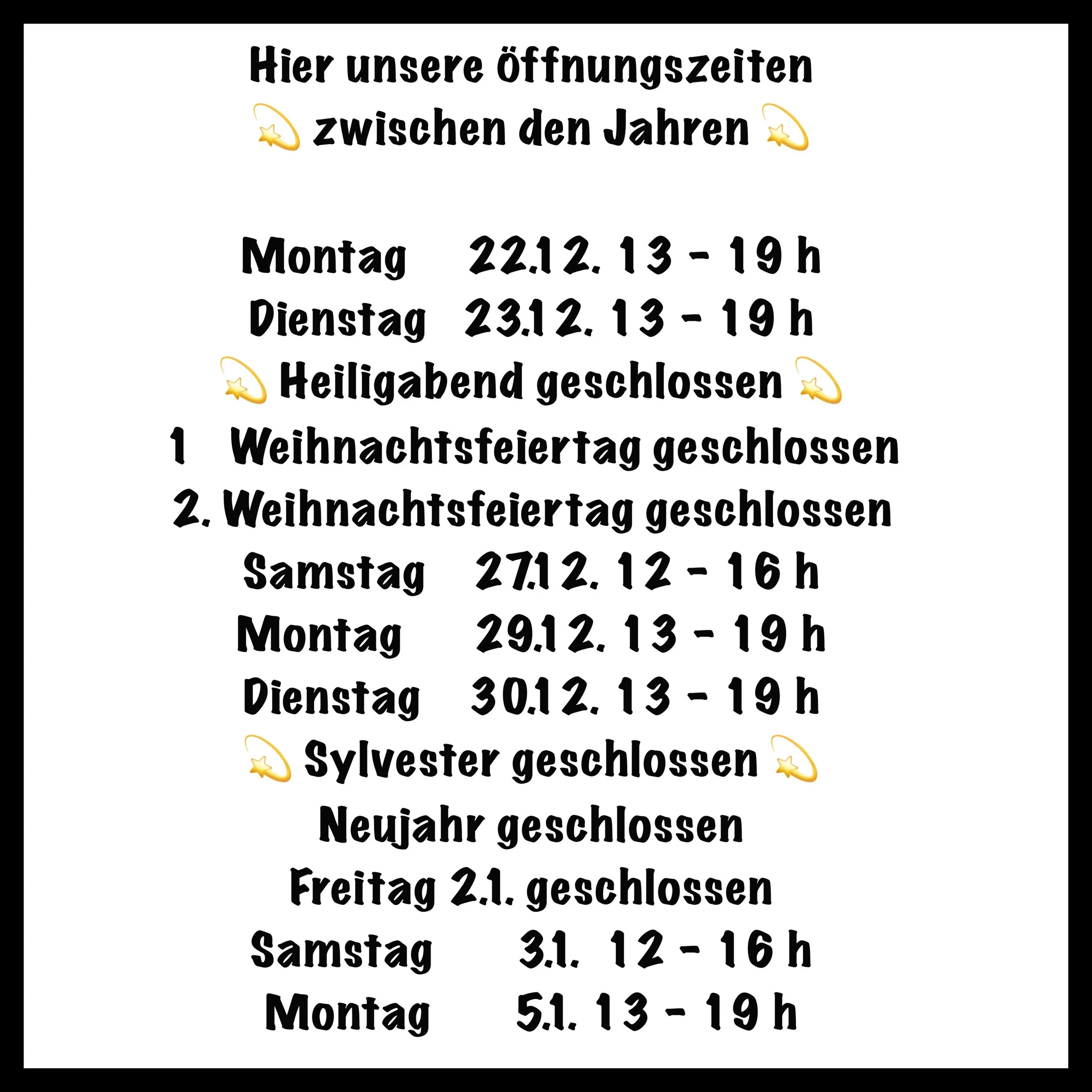 Hier sind unsere Öffnungszeiten für diese Woche und zwischen den Jahren.